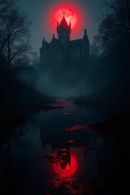 어두우며 기괴한 분위기, 피처럼 붉은 달 아래 성채, 검은 호수에 비친 그림자가 파문을 일으키고, 안개가 기어오르며 벽 속에 비밀이 숨어 있다.
