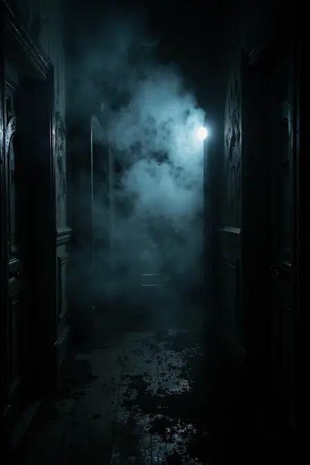 어두우며 기괴한 분위기, 오래되고 흐릿하게 조명된 복도, 먼지가 휘날리고, 희미한 속삭임이 울려 퍼지며, 단 하나의 깜빡이는 전구가 공포스러운 그림자를 만든다.