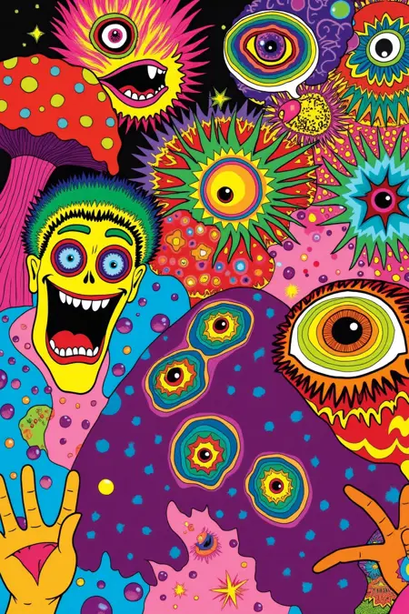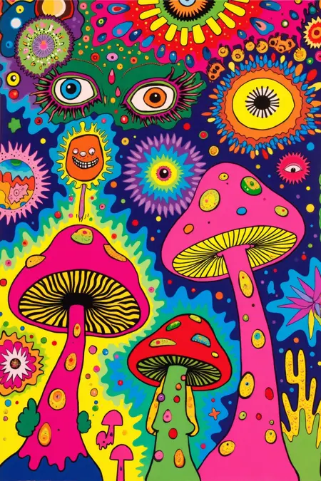 생동감 있는 사이키델릭 패턴, 녹아내리는 형태, 별빛 같은 눈, 버섯 구름이 어우러진 트립한 시각적 축제.