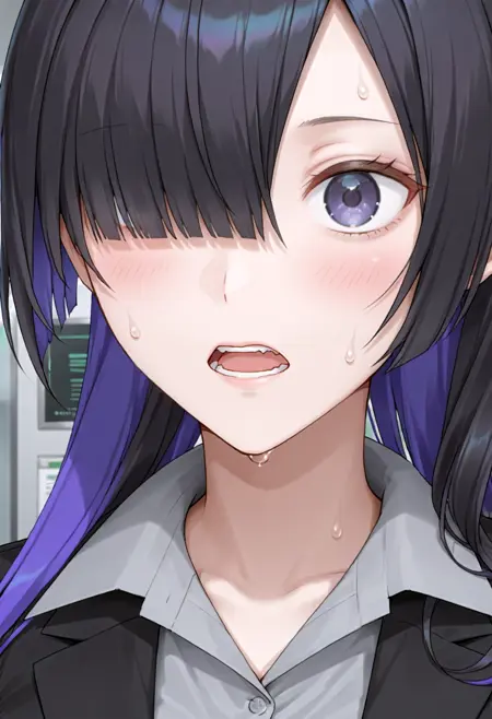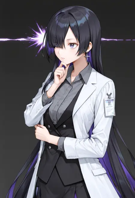 YogatariTobari, purple eyes, very long hair, black hair, purple hair, multicolored hair, hair over one eye, large breasts,