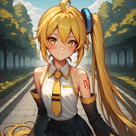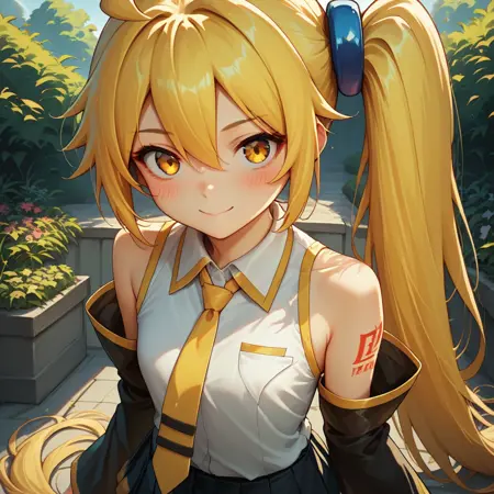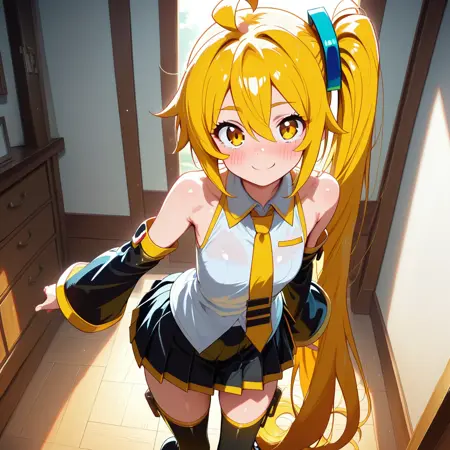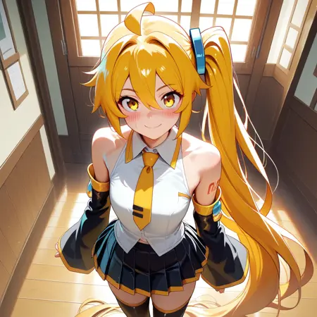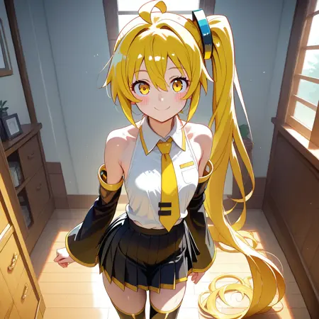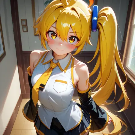 Akita Neru, ahoge,absurdly long hair,blonde hair,side ponytail,hair ornament,sidelocks,hair between eyes,parted bangs,yellow eyes