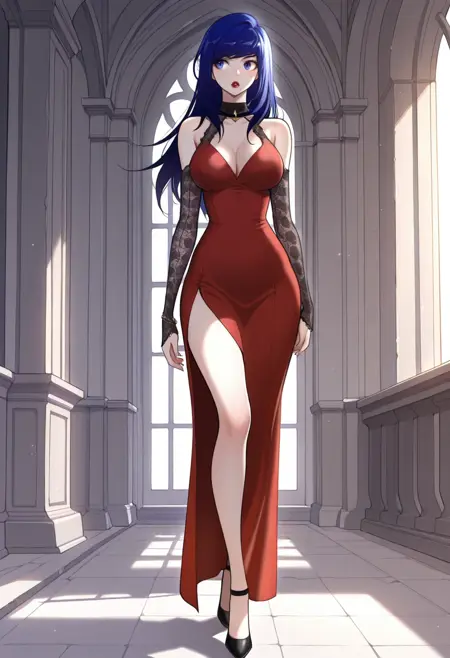 赤いドレス, 肩出し, 肩までの手袋, ジュエリー, 胸元の開き, 横スリット, 黒い靴,