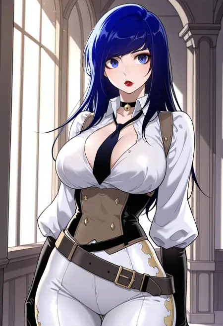 白いシャツ, 首輪, 黒いネクタイ, コルセット, 白いズボン, ベルト, 手袋, 黒い靴下,