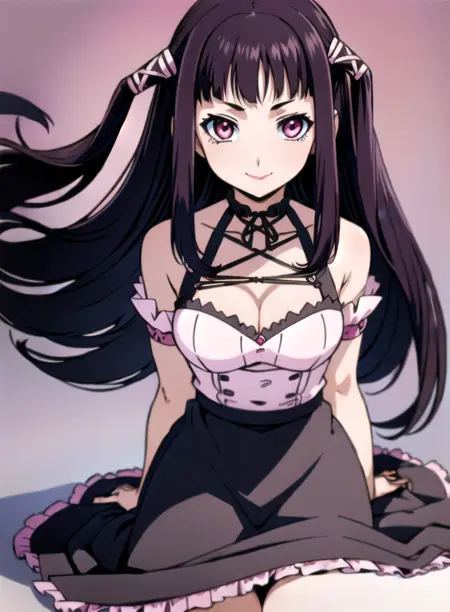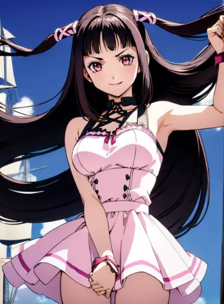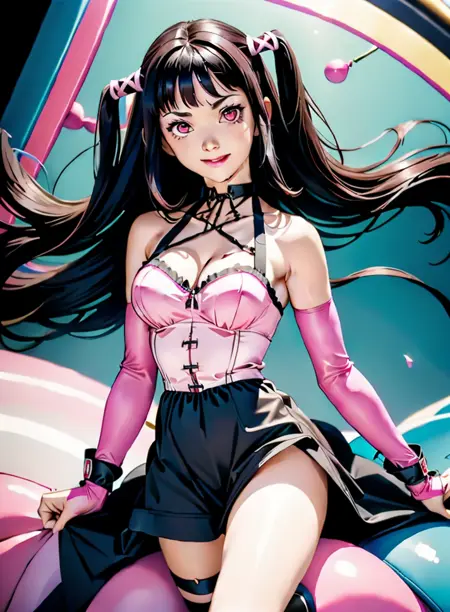 衣装: 肘まで手袋, 長いスカート, 胸元の露出, ツインテール, ドレス, チョーカー, 肩の露出, 手袋, 別れ袖, ピンクのコルセット, 黒いスカート