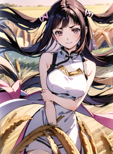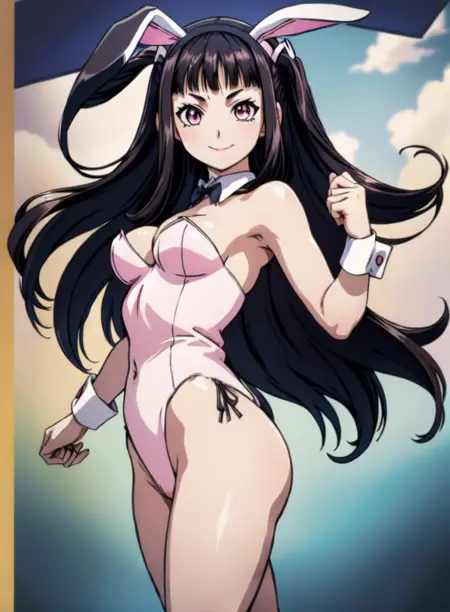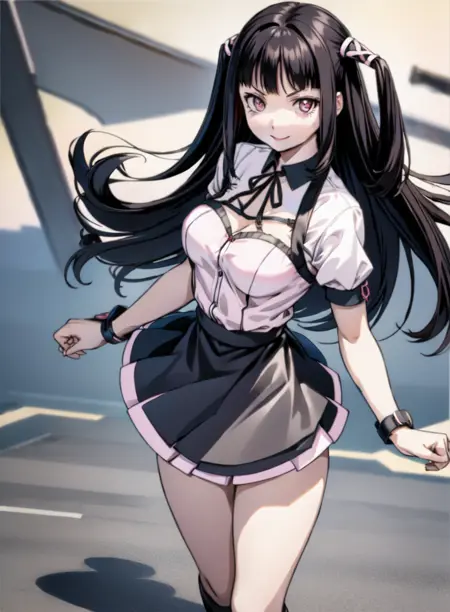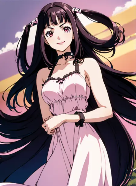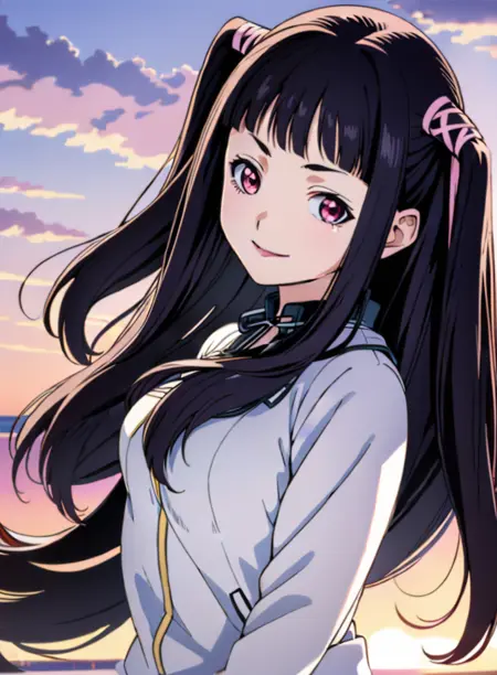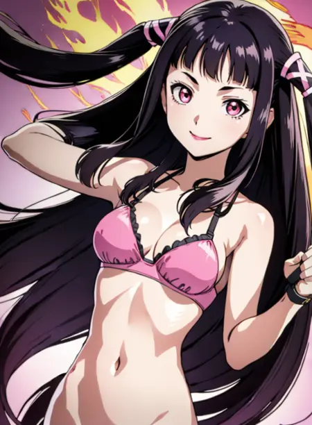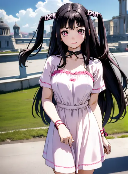 外見: 1girl, solo, 黒髪, 笑顔, 胸, リボン, 長髪, 両サイド上げ, 髪のリボン, 桜色の目, ツインテール, 中程度の胸, 視線は観客へ, 前髪, 突き出し前髪, リップスティック