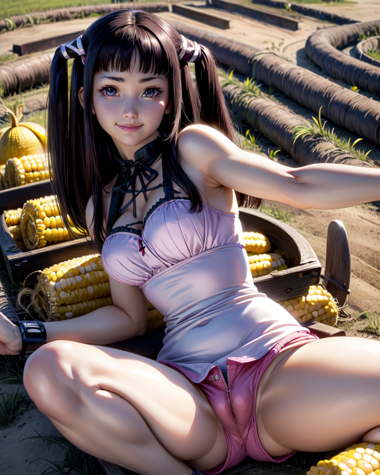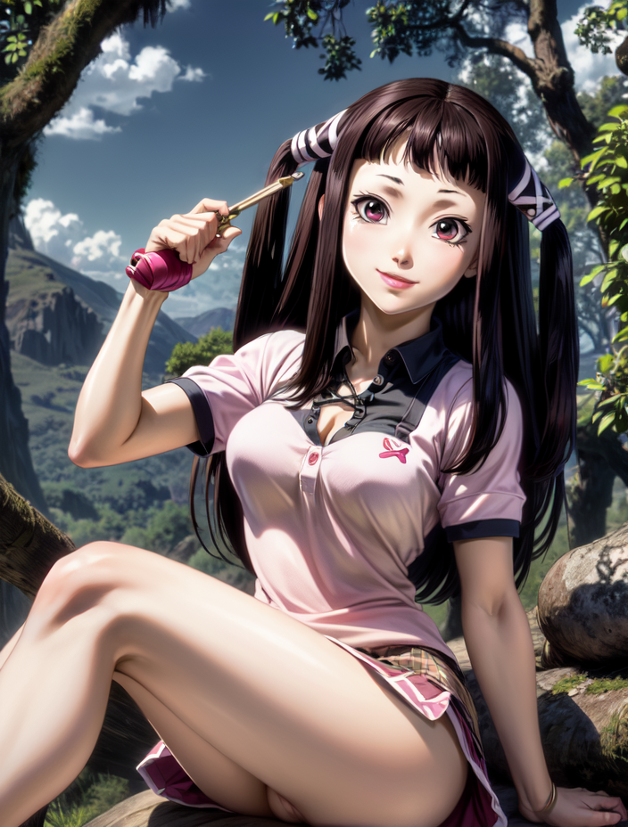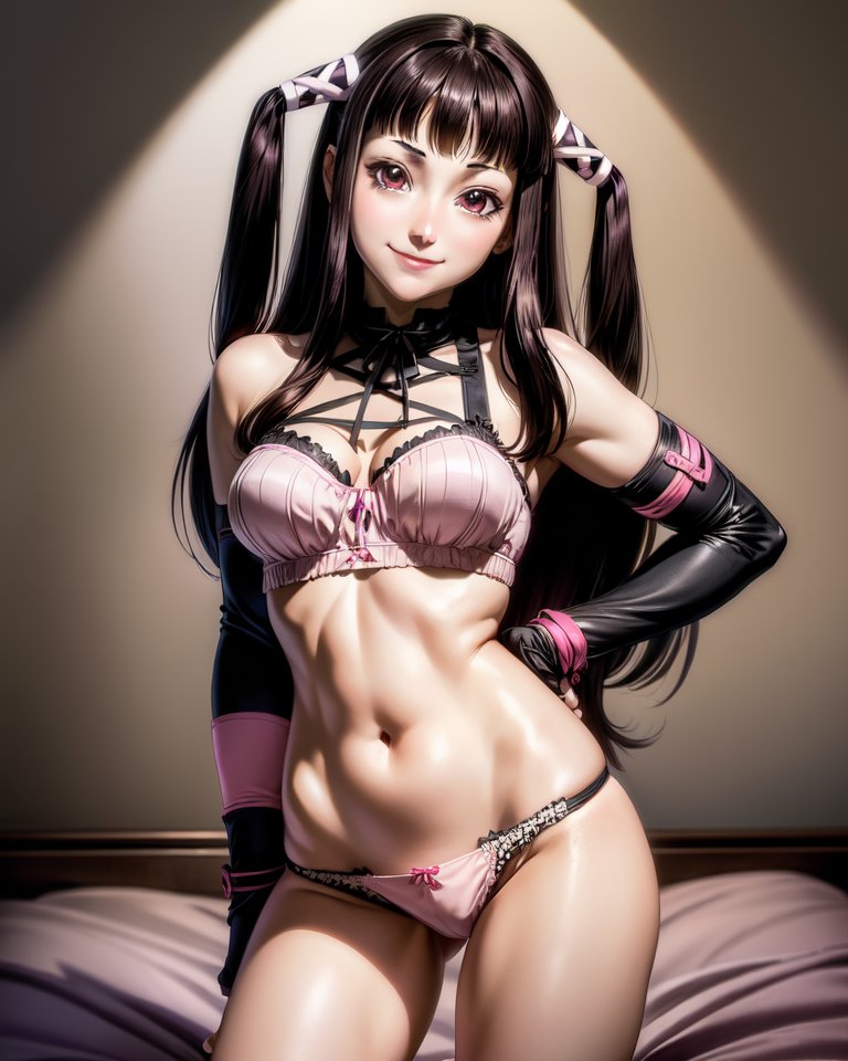 외모: 1소녀, 싱글, 검은 머리, 미소, 가슴, 리본, 긴 머리, 양쪽 올림, 머리 리본, 분홍색 눈, 트윈테일, 중간 가슴, 시청자 바라보기, 앞머리, 곧은 앞머리, 립스틱