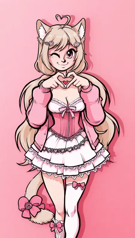 AkemiKurai, akemikurai, 1girl, animal ears, animal ear fluff, virtual youtuber, cat ears, breasts, tail, solo, long hair, cleavage, thighhighs, cat girl, cat tail, tail ornament, ahoge, hair ornament, heart chain, pink eyes, low twintails, frills, cardigan, skirt, paw hairclip, asymmetrical legwear, collar,