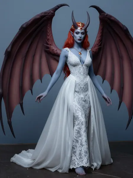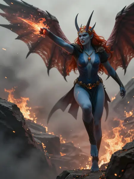 Main tag is "mizora" but as is the case in most flux loras, you need to sort of also describe the character. A simple example is "a demonic woman with pale blue skin, red hair, wearing blue gown and a headdress. she has a pair of large demon wings"