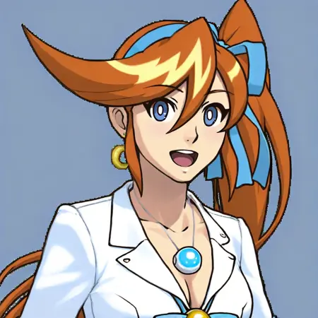 1girl, solo, Athena Cykes, orange hair, long hair, ponytail, side ponytail, blue eyes, white shirt, collared shirt, blue necktie, yellow jacket, cropped jacket, open jacket, single glove, partially fingerless glove, yellow skirt, miniskirt, black tights, white boots