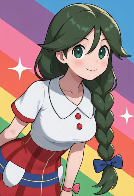 hair ribbon, blue ribbon. dress, collared shirt, white shirt, short sleeves, red buttons, red skirt, medium skirt, striped skirt, blue stripes, multicolored clothess, white pockets, wrist bow, pink bow, single bracelet, white socks, red footwear, mary janes