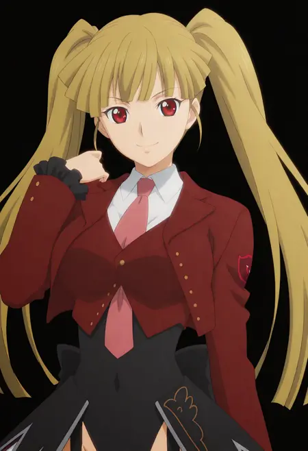 1girl, solo, asmodeus, stakes of purgatory, blonde hair, long hair, twintails, red eyes, bangs