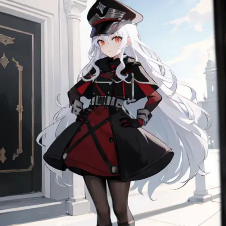 AG Atlas, 1girl, solo, 긴 머리, 빨간 눈, 장갑, 모자, 눈 사이의 머리카락, 매우 긴 머리, 흰색 머리, 팬티스타킹, 부츠, 검은 장갑, 유니폼, 코트, 검은 팬티스타킹, 군사, 검은 머리장식, 군사 유니폼, 캐플릿, 뾰족한 모자, 군사 모자, 검은 캐플릿, 작고 날씬한 체형, 작은 가슴, 성인