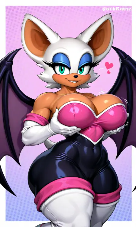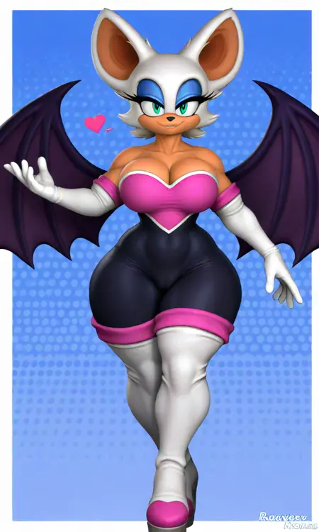 태그: rouge_Reivene, 흰색 털, 밝은 갈색 피부, 청록색 눈, 박쥐 귀, 파란색 아이섀도우, 박쥐 날개, 검은색 바디수트, 드러난 어깨, 분홍색 심장형 가슴판, 흰색 장갑, 분홍색 장식이 있는 흰색 하이힐,