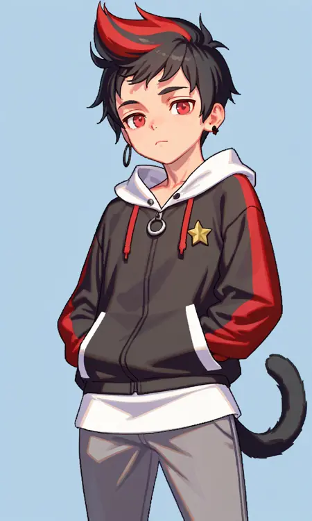 태그 요소: DCOh-Sang-wook, Oh-Sang-wook, 1boy, solo, 단발, 짧은 큐프 헤어스타일, 스파이키 큐프, 검은 머리, 빨간 머리, 다색 머리, 스트라이프 머리, 빨간 눈,