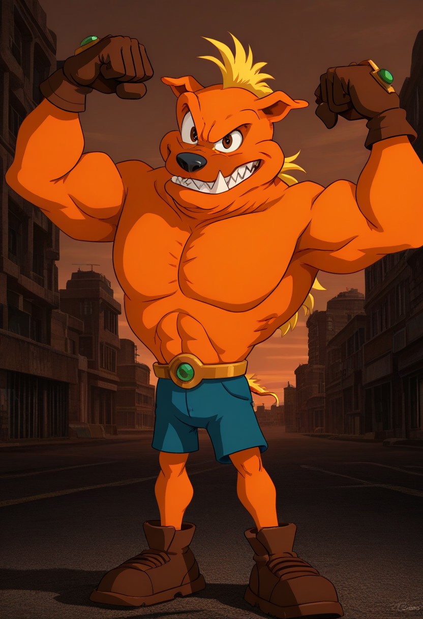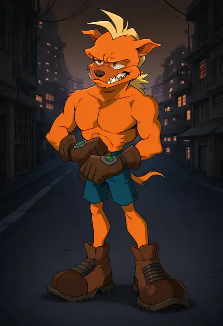 Dingo, orange skin, brown muzzle, brown eyes, sharp teeth, muscular, buff, blue shorts, brown gloves