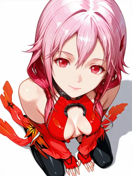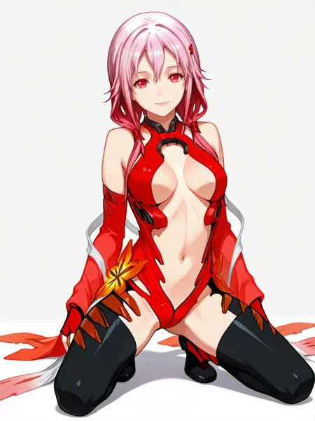 yuzuriha inori,pink hair,red eyes,medium breasts,red clothing,center opening,detached sleeves,fingerless gloves,black thighhighs,