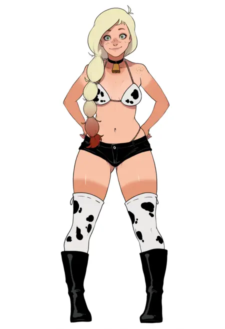 Lucy (OC) prompts : lucy, 1girl, freckles, blonde hair, long hair, green eyes, hair over shoulder, braid, boots, cow print, tanlines, thighhighs, body freckles, bikini, cow print thighhighs, navel, neck bell, cow print bikini, shorts, choker, black knee boots, black shorts