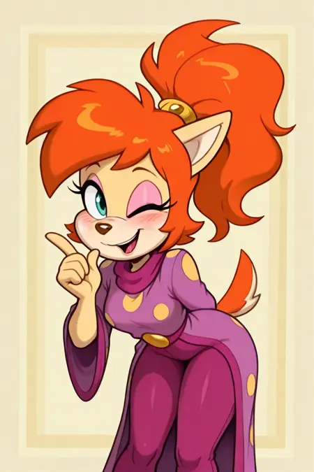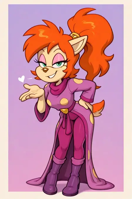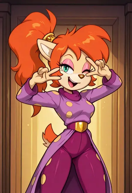 anthropomorphic fox, pale yellow fur, orange hair in high ponytail by gold hair band with green details, teal eyes, brown nose, orange tail with pale yellow tip, pale pink eyeshadow, fuchsia and purple robe with yellow polka-dots that is fastened with gold buckle, purple leggings with yellow polka-dots, purple boots with few small yellow polka-dots