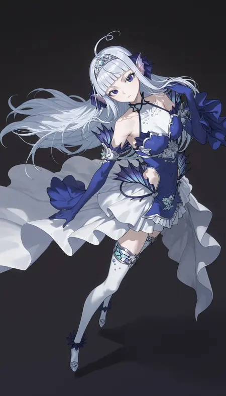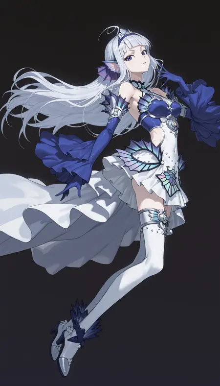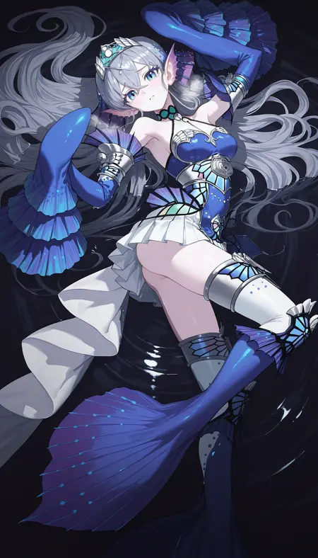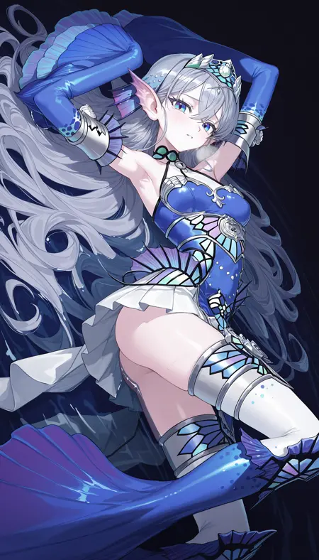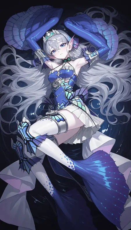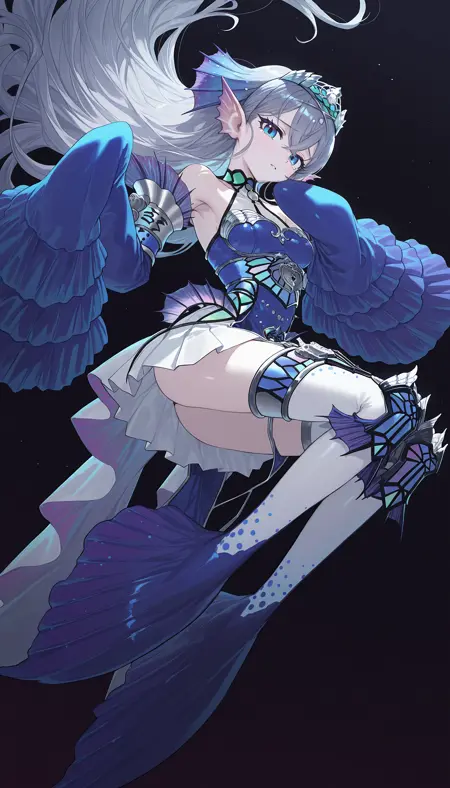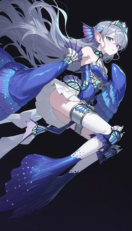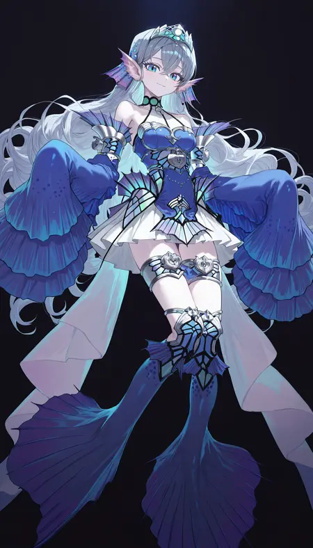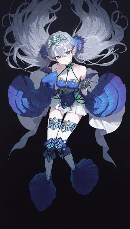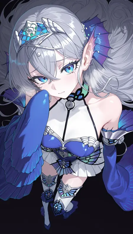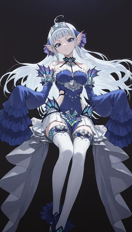 blue eyes, gradient eyes, grey hair, pointy_ears, silver tiara, colored skin,