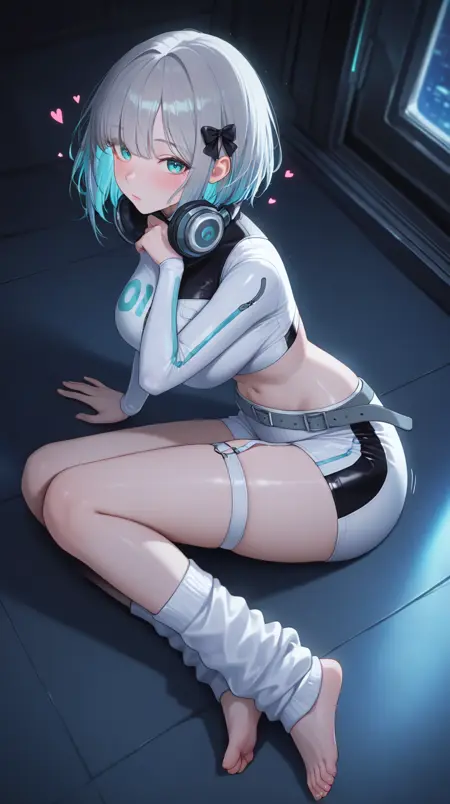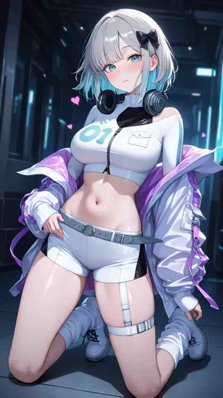 | 训练词汇 | KagaSumireShowdown, grey hair, multicolored hair, short hair, bangs, hair bow, black bow, blue eyes, headphones around neck, white crop top, white sleeves, sleeves past wrists, long sleeves, nylon jacket, purple inner jacket, white jacket, open jacket, off shoulder, zipper, midriff, grey belt, white shorts, single garter strap, white strap, loose socks, white boots, laced boots,已复制! |