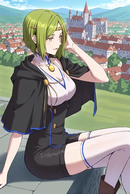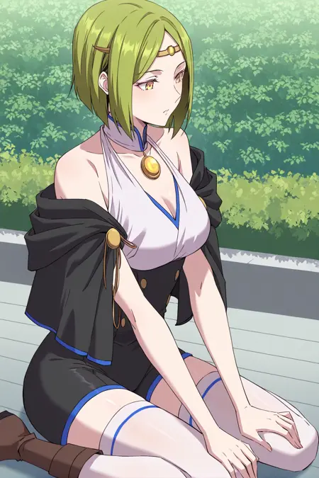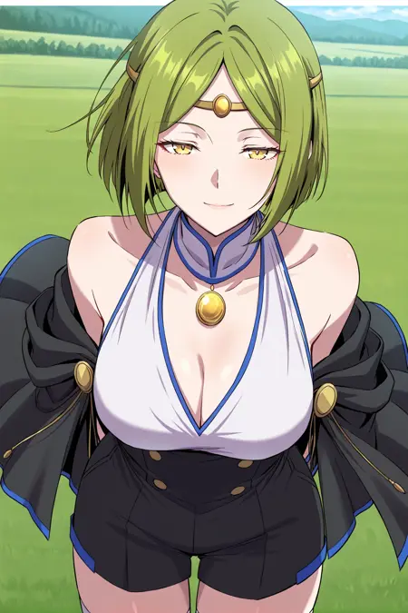Shillia, 1girl, solo, yellow eyes, green hair, short hair, straight hair, parted bangs, hair between eyes, sidelocks, gold tiara,