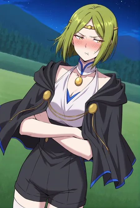 Shillia_outfit, black capelet, blue trim, gold buttons, white top, halter top, detached collar, blue trim, gold pendant, sleeveless top, deep neckline, black shorts, tight shorts, white thighhighs, brown boots,