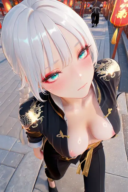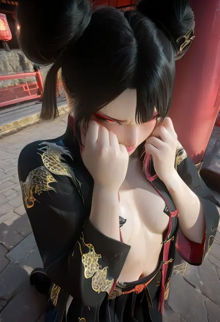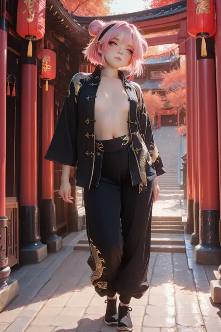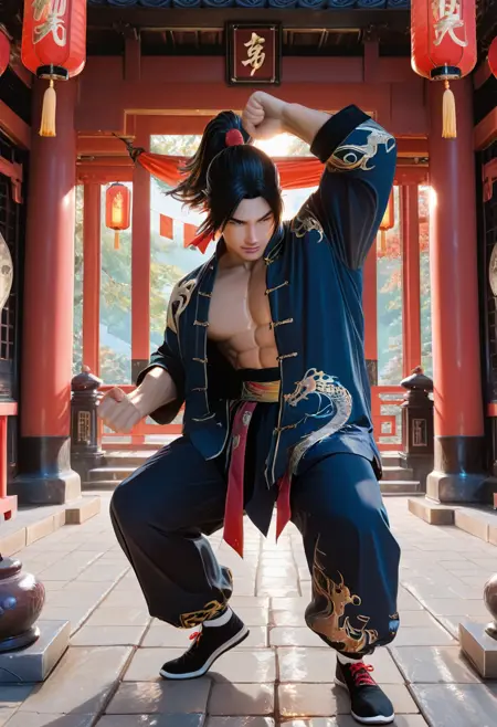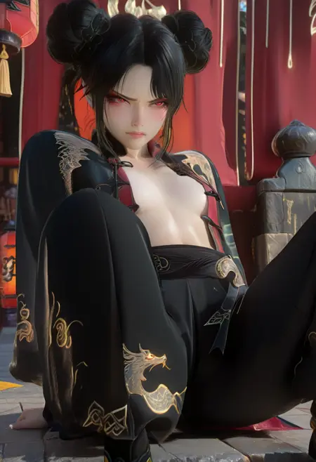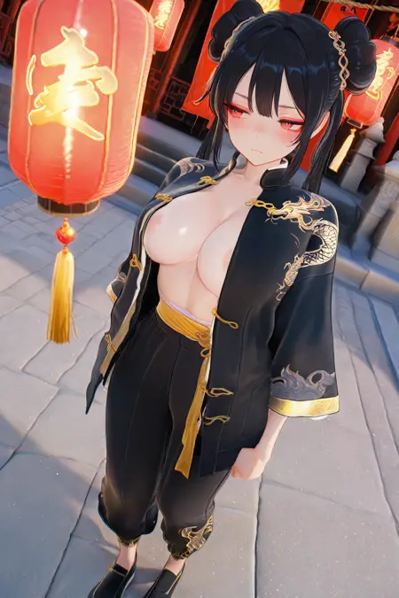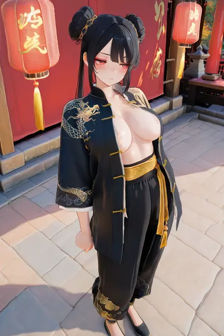 トリガー語(Trigger word): open clothes,black_clothes,black footwear,black pants,chinese clothes,dragon print,