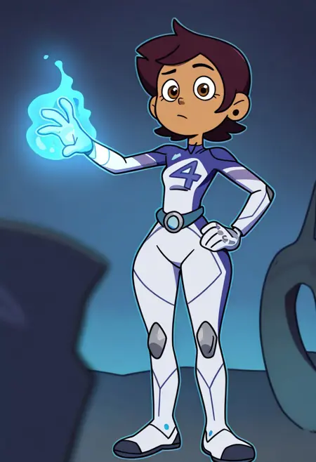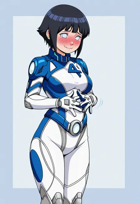 수에스토린, 전체 몸피팅, 오른쪽 가슴에 4개의 기호, 흰색 전술복, 파란 액센트가 있는 복장, 긴 소매, 흰색 및 파란색 전술 장갑,