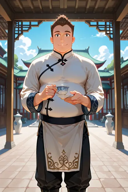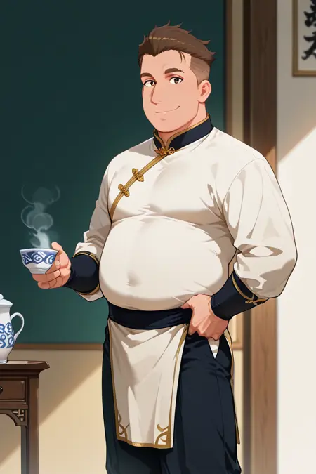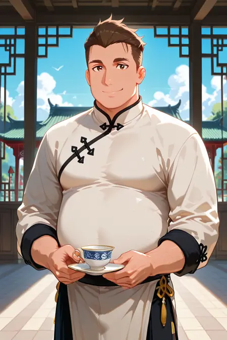 Mort, 1boy, male, tall, stocky, plump, light skin, dark brown eyes, brown hair, brown eyebrows, dark navy blue t-shirt, white sleeves, blue jeans, red sneakers,