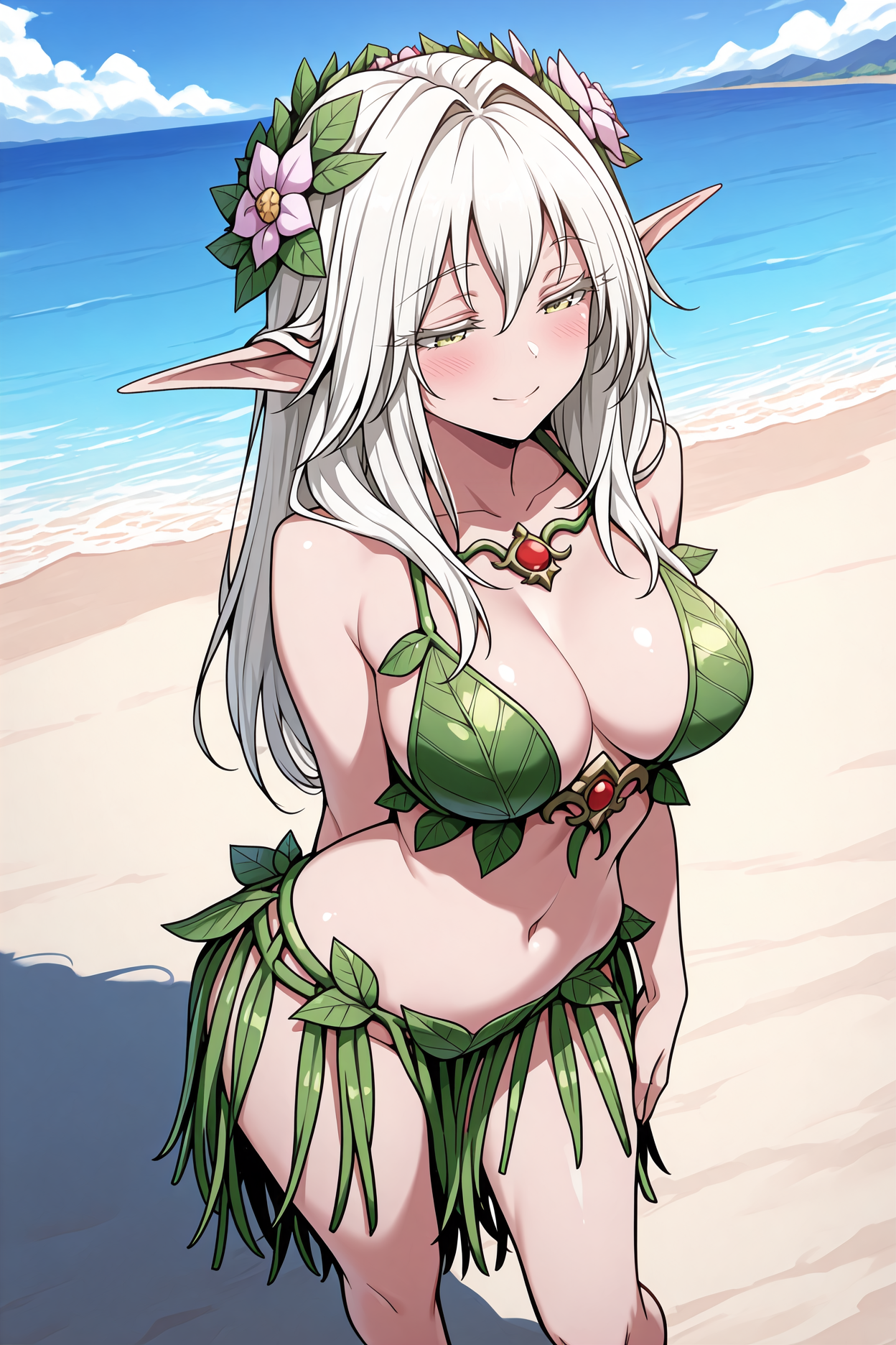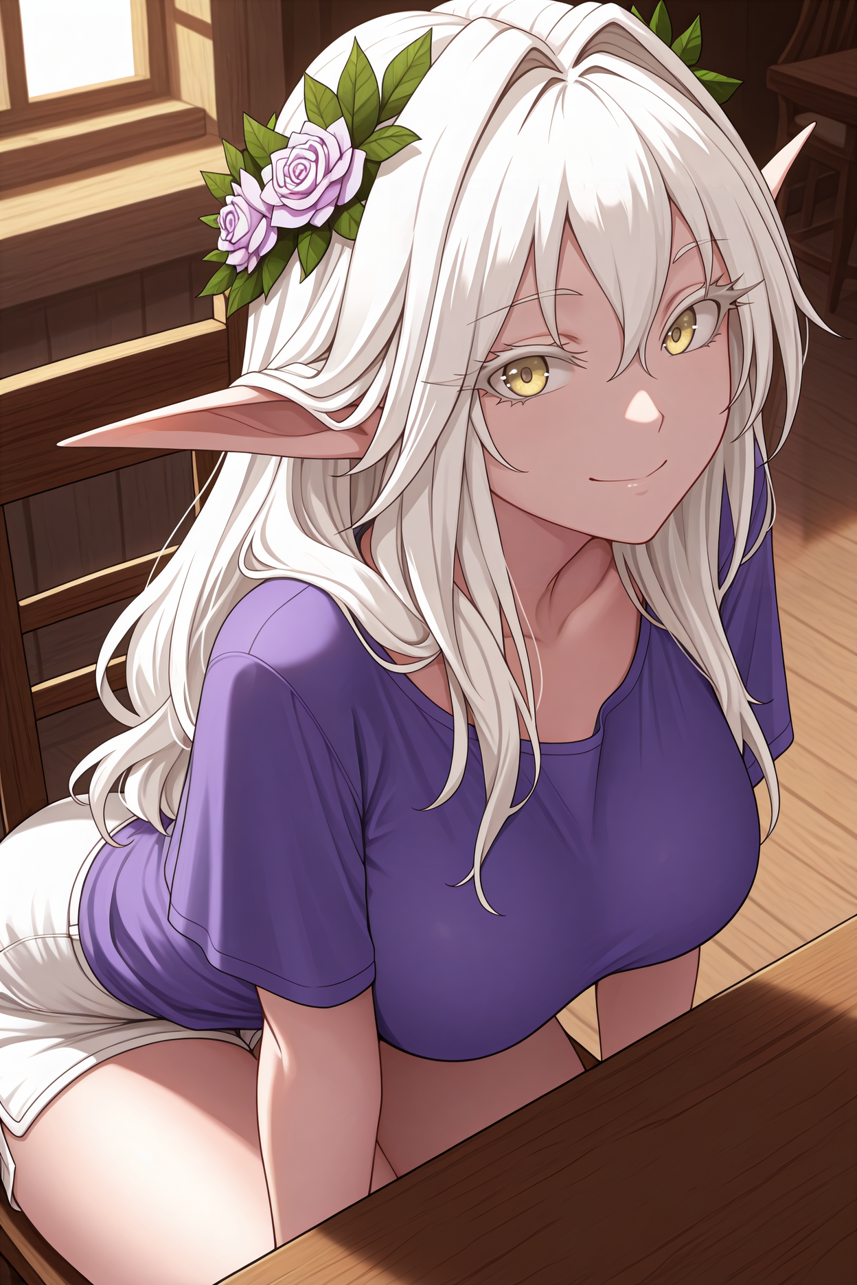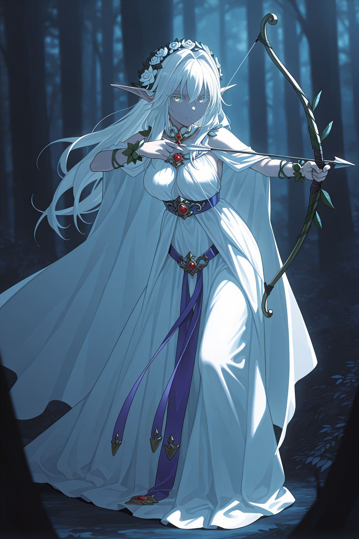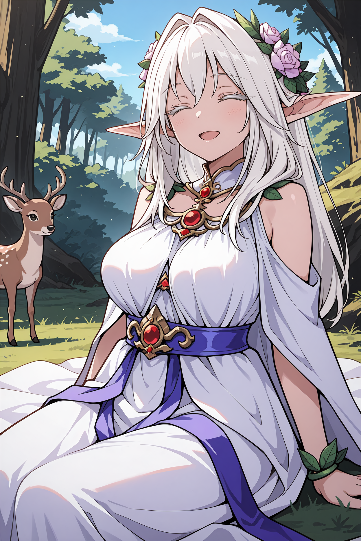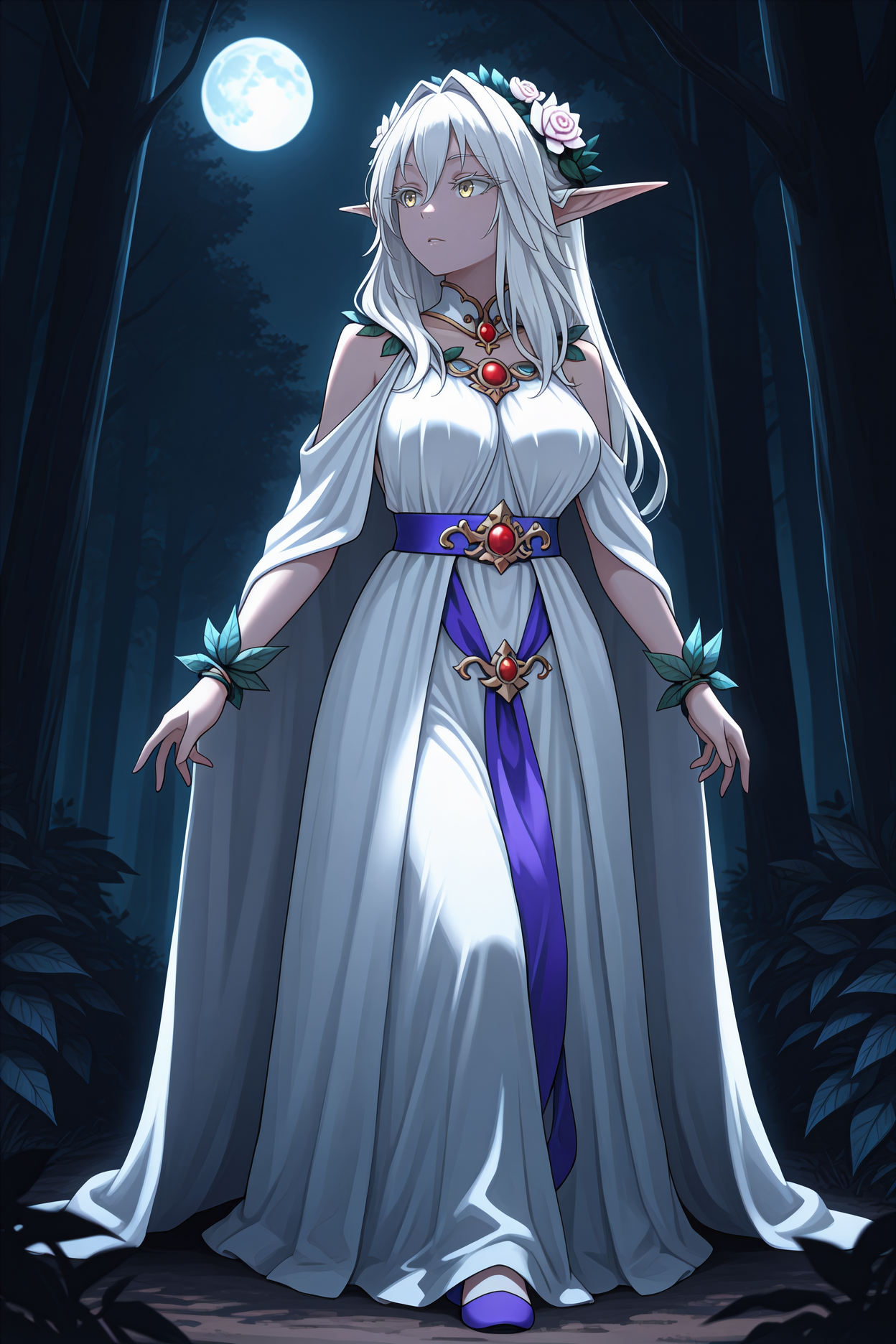 그녀의 전형적인 외모를 위해 "머리카락 꽃, 머리 관, 하얀 망토, 분리된 칼라, 하얀 드레스, 긴 드레스, 어깨 노출, 보라색 허리띠, 잎 팔찌"를 추가하세요.