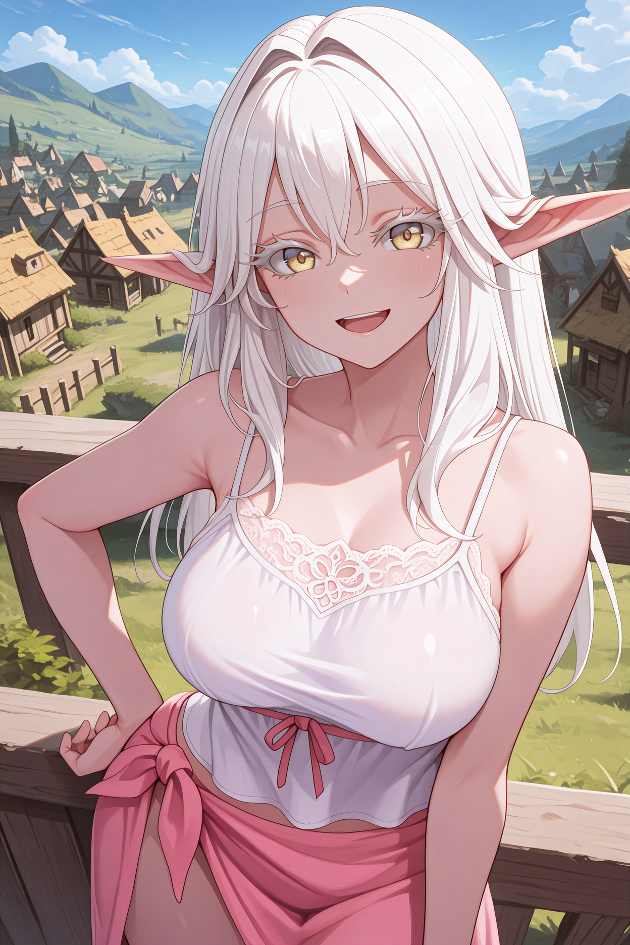 트리거 단어는 "fstpc"이며, "뾰족한 귀, 하얀 머리, 긴 머리, 눈 사이의 머리카락, 머리카락이 얼굴을 가리는 것, 노란 눈, 하얀 속눈썹"이 필수입니다.
