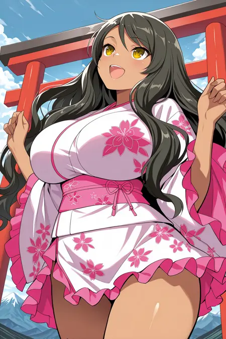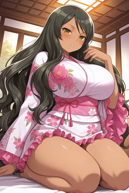 着物には、「フリル付き着物、短い着物、花柄、白い着物、ピンクの帯、広い袖」を追加してください。