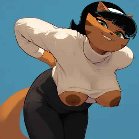 cat, cat girl, brown fur, black hair, bangs, green eyes, black nose, fluffy cat tail, mature female, large breasts, dark nipples, white hair band,