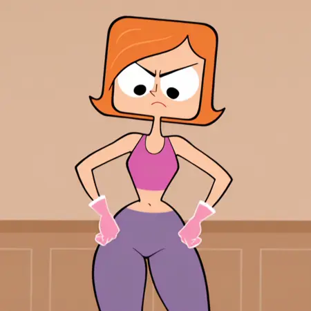 トリガー:Deb, 1girl, オレンジ色の髪, 黒い目, クロップトップ, ヨガパンツ, 短髪, 幅広い hip, 前髪の流れたスタイル, 胸