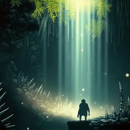 洞穴顶部垂挂着黑暗、滴水的藤蔓,增强了阴冷潮湿的氛围。整体照明柔和,雾气中透出微弱的光晕,投下长长的阴影,营造出深度与神秘感。场景唤起一种古老而未被触及的荒野与宁静。画面边缘由一道微妙的、发光的缥缈光线框定。