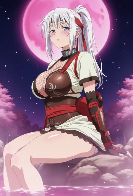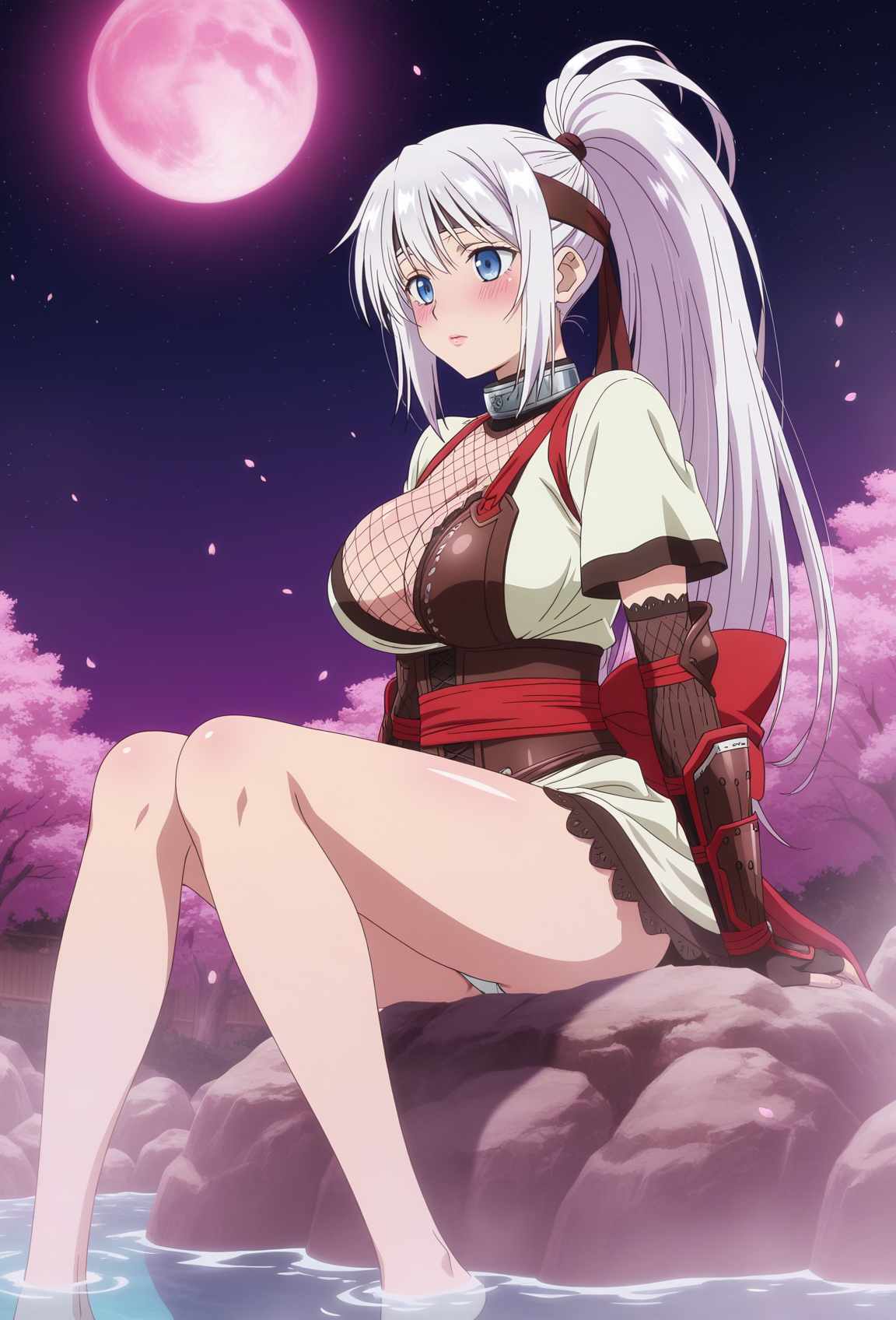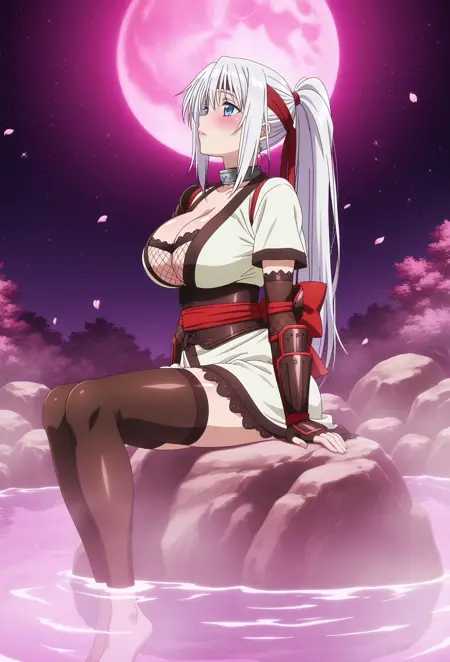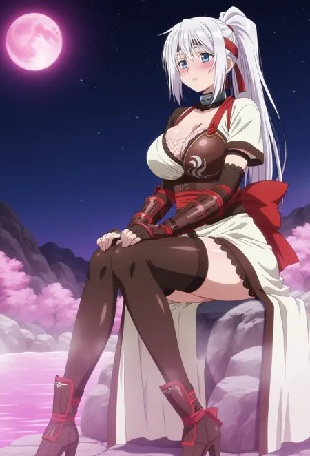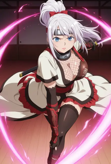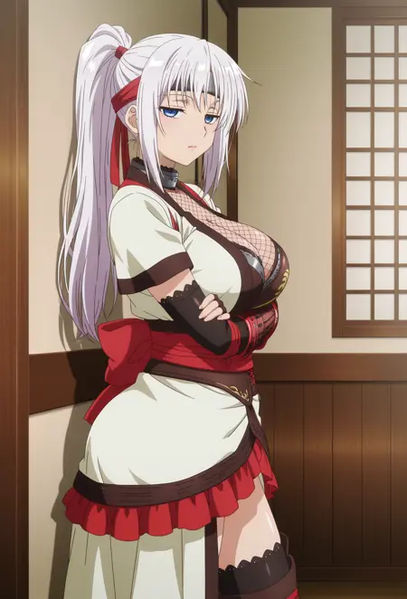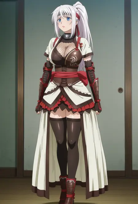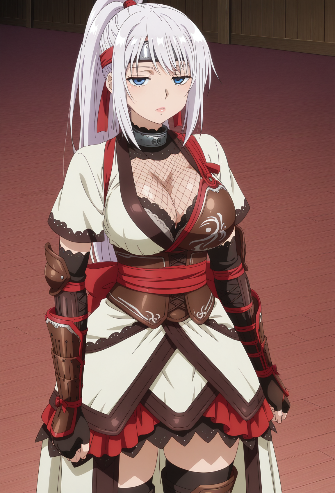 asoka_(ge), 1girl, solo, mature female, large breasts, large ass, white hair, long hair, headband, ponytail, high ponytail, sidelocks, blue eyes, lips, cleavage, white dress, armored dress, armor, asymmetric armor, ninja, fishnets, short sleeves, large bow on back, long skirt, thighhighs, arm guards, vambraces, fingerless gloves, elbow gloves, sash, boots, thighs, zettai ryouikki, black thighhighs, high heels,