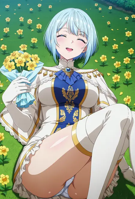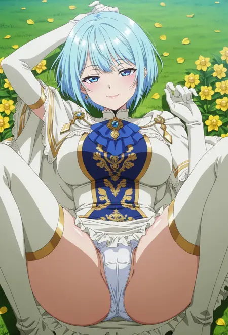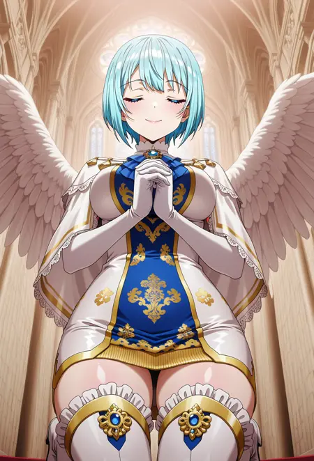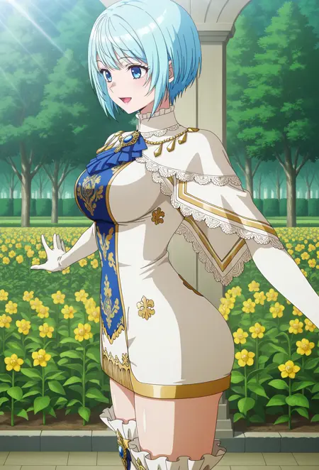 anies_(ge), 1girl, solo, 성녀, 큰 가슴, 큰 엉덩이, 연한 파란 머리카락, 파란 눈, 단발, 볼컷, 입술, 보석, 프릴, 브로치, 파란 애스코트, 십자가 모양의 목걸이, 금장식, 자수, 흰 드레스, 짧은 드레스, 흰 캐플릿, 흰 장갑, 팔꿈치 장갑, 젯타이 리ョ우이키, 프릴 장식된 허벅지 양말, 흰 허벅지 양말, 흰 신발, 부츠, 허벅지 부츠,