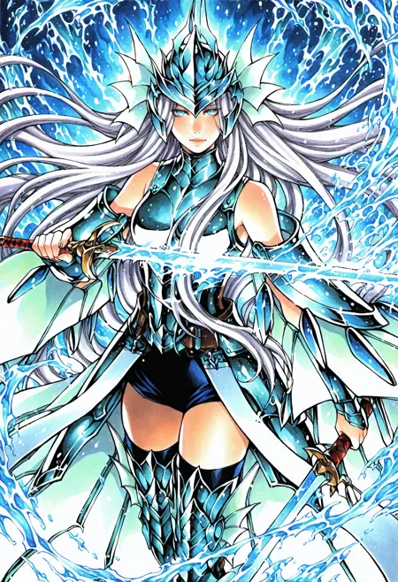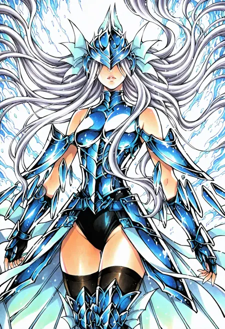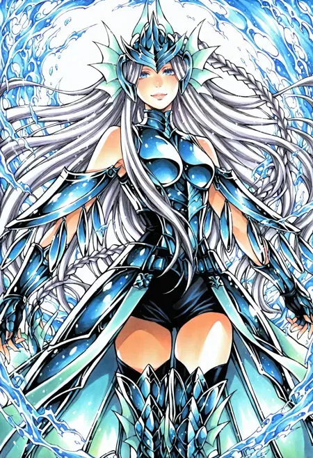 天鲸圣衣: 角,裸露的肩膀,翅膀,胸部,中等大小的胸部,护手,头盔,胸甲,手套,胫甲,铠甲,蓝色铠甲,过膝长筒袜,紧身衣,靴子,铠甲靴,高跟鞋,头饰,发辫,臂甲