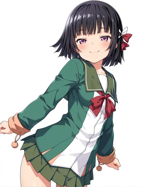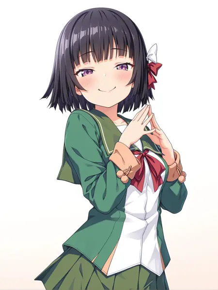トリガーワード ・e_s_ishigaki,short hair,hair ribbon,purple eyes,black hair,