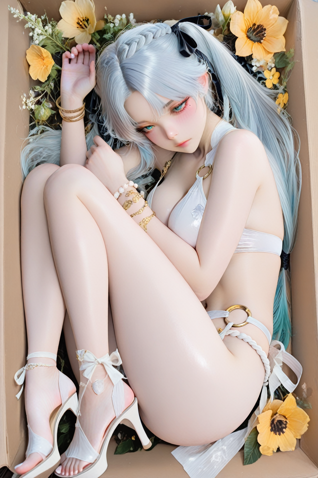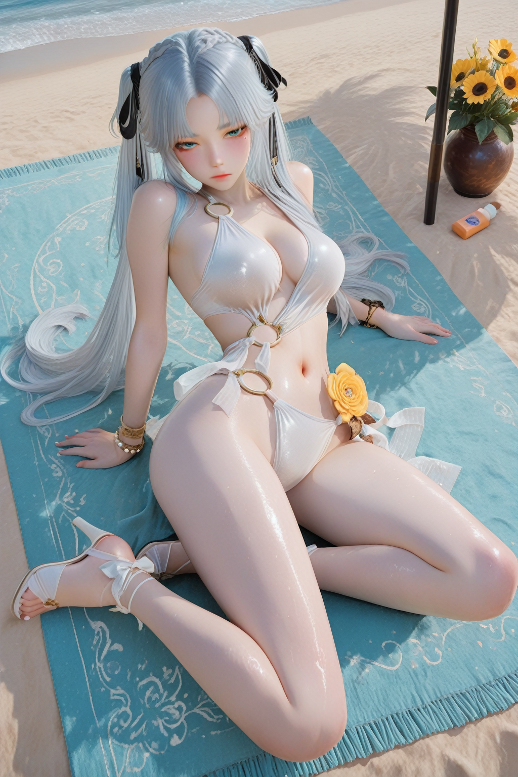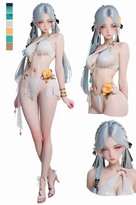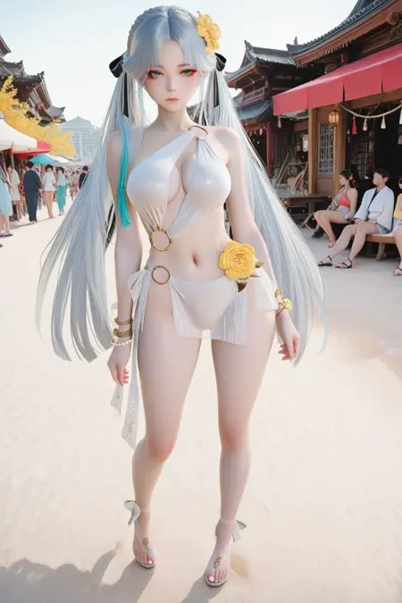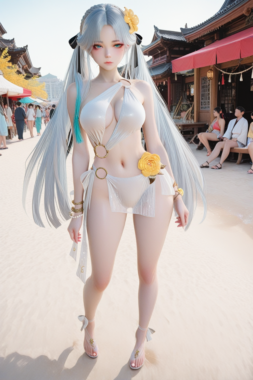 トリガーワード (Trigger word): ji yingying,o-ring,bare shoulders,cleavage,strappy heels,white shoes,hair ribbon,ribbon,jewelry,bracelet,bikini,yellow flower,