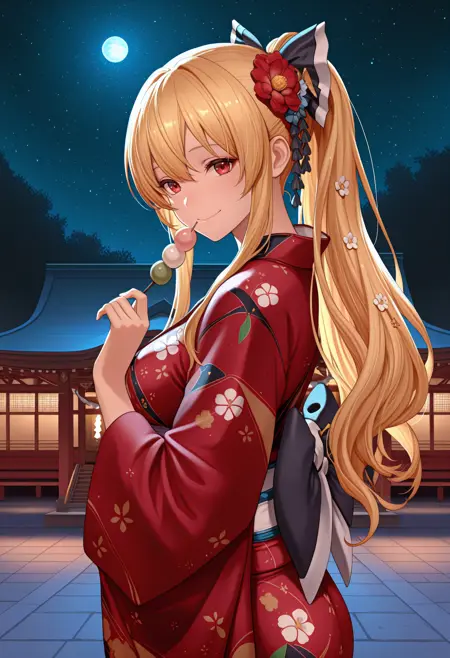 V1raNwYrs, red eyes, blonde hair, long hair, ponytail, black bow, hair flower, red kimono, wide sleeves, sash, floral print