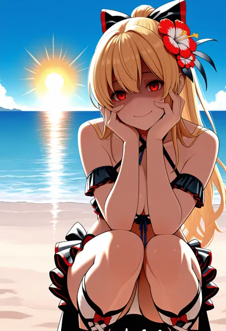V1raSmmr, red eyes, blonde hair, long hair, ponytail, hair flower, black bow, white bikini, halterneck, arm garter, frills, black bikini skirt, cross-laced footwear