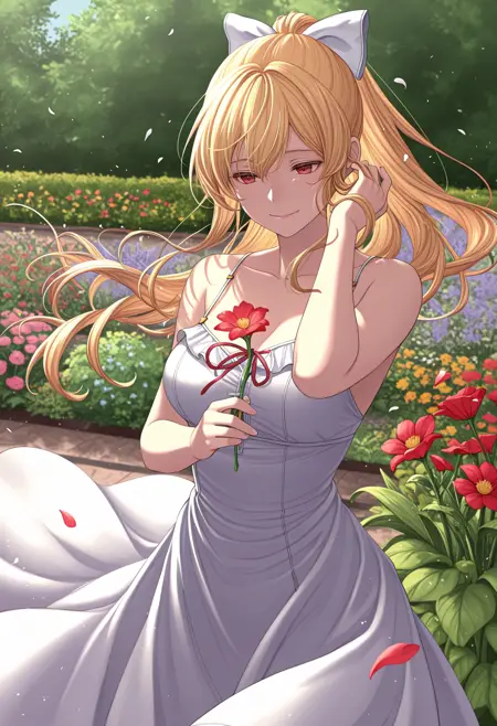 V1raWnd, red eyes, blonde hair, long hair, ponytail, white bow, white sundress, sleeveless, spaghetti strap, red ribbon