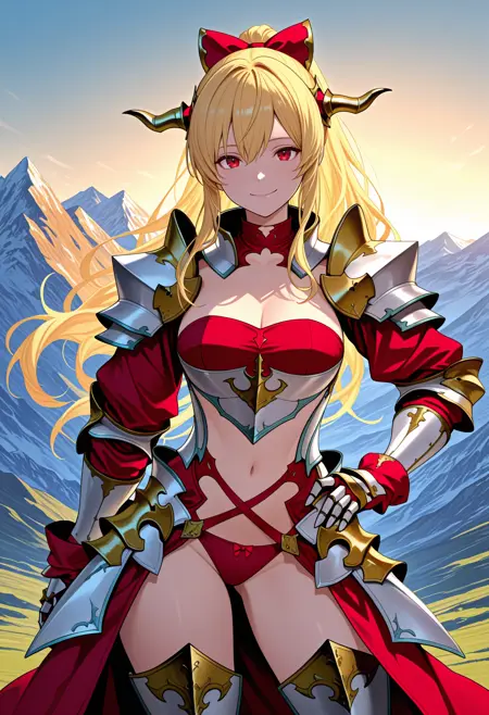 V1raGrnd, 빨간 눈, 금발, 긴 머리, 파니테일, 가짜 뿔, 빨간 리본, 갑옷 드레스, 비키니 갑옷, 빨간 드레스, 어깨 갑옷, 장갑, 배꼽, 빨간 팬티, 갑옷 부츠