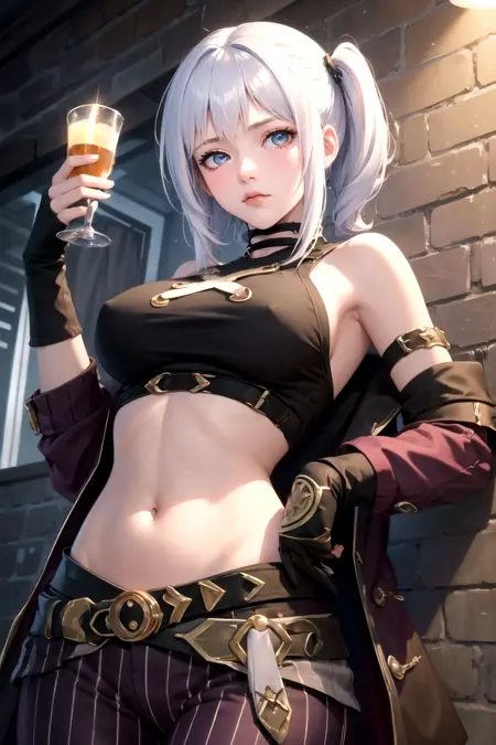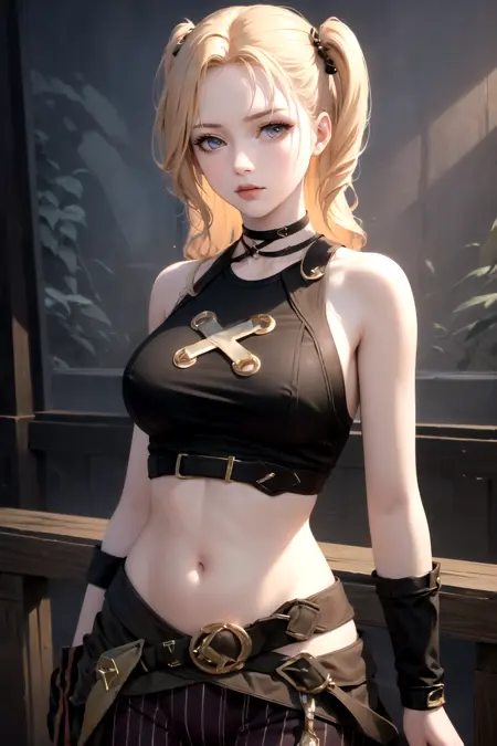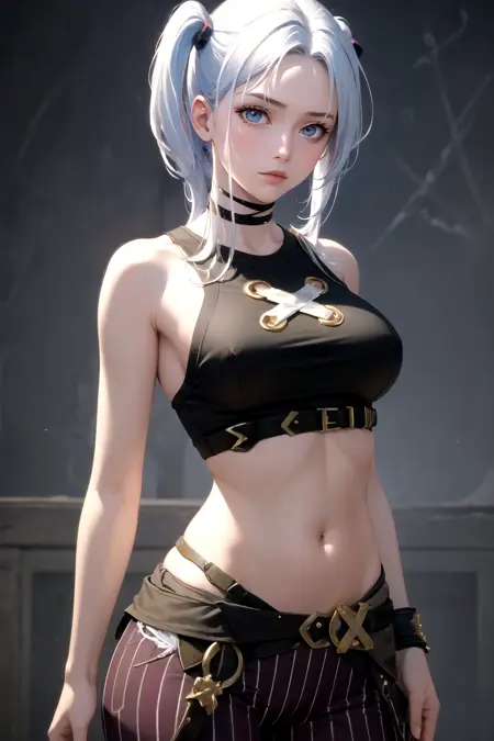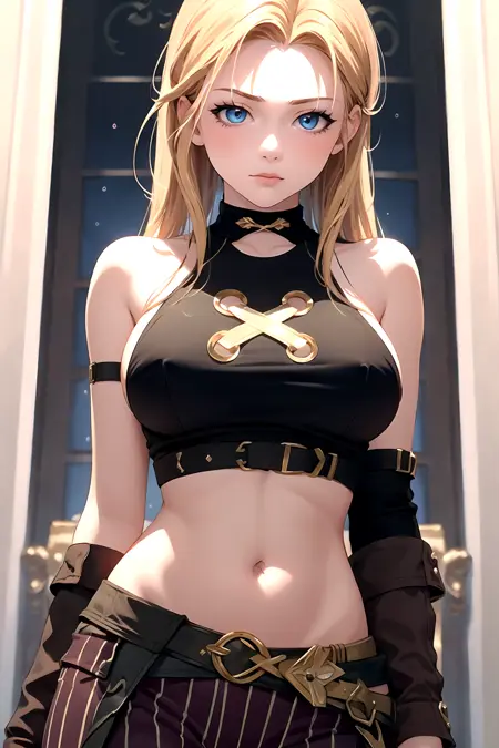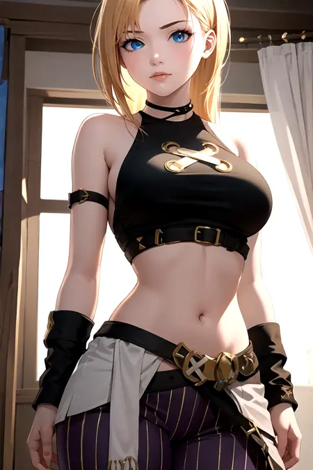 arcanejinxcos, stomach, sleeveless, striped pants