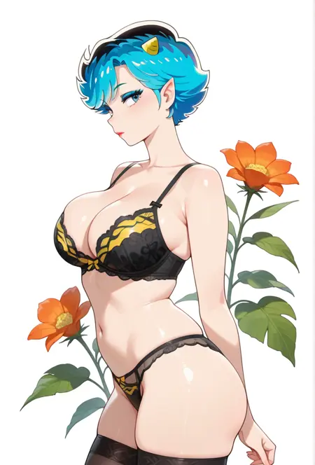 BlackBra_LumsMother_Urusei_Yatsura2022_ownwaifu, 1girl, afro, blue eyes, blue eyeshadow, blue hair, collarbone, eyelashes, eyeliner, lum's mother, makeup, mature female, oni horns, pointy ears, short hair, small horns, yellow horns, black bra, lipstick, navel, underwear only, black panties, black thighhighs, cleavage, large breasts, panties, shiny skin,