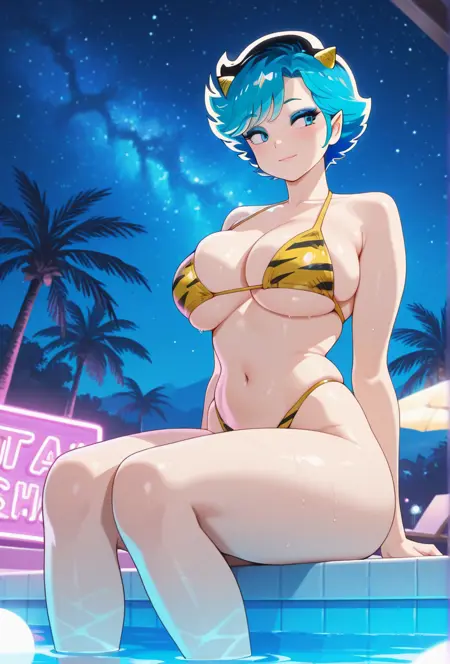 Bikini_LumsMother_Urusei_Yatsura2022_ownwaifu, 1girl, afro, aqua eyes, aqua hair, blue eyeshadow, blue hair, collarbone, eyelashes, eyeliner, lum's mother, makeup, mature female, multicolored hair, oni horns, pointy ears, short hair, small horns, swimsuit, tiger print, yellow bikini, yellow horns, animal print, cleavage, large breasts, micro bikini, print bikini, skindentation, bare shoulders, highleg bikini, thick thighs, two-tone hair,