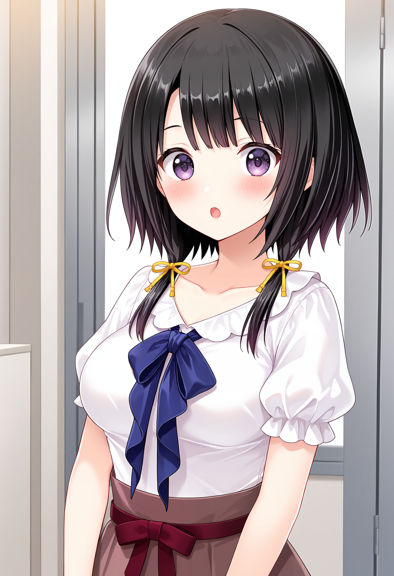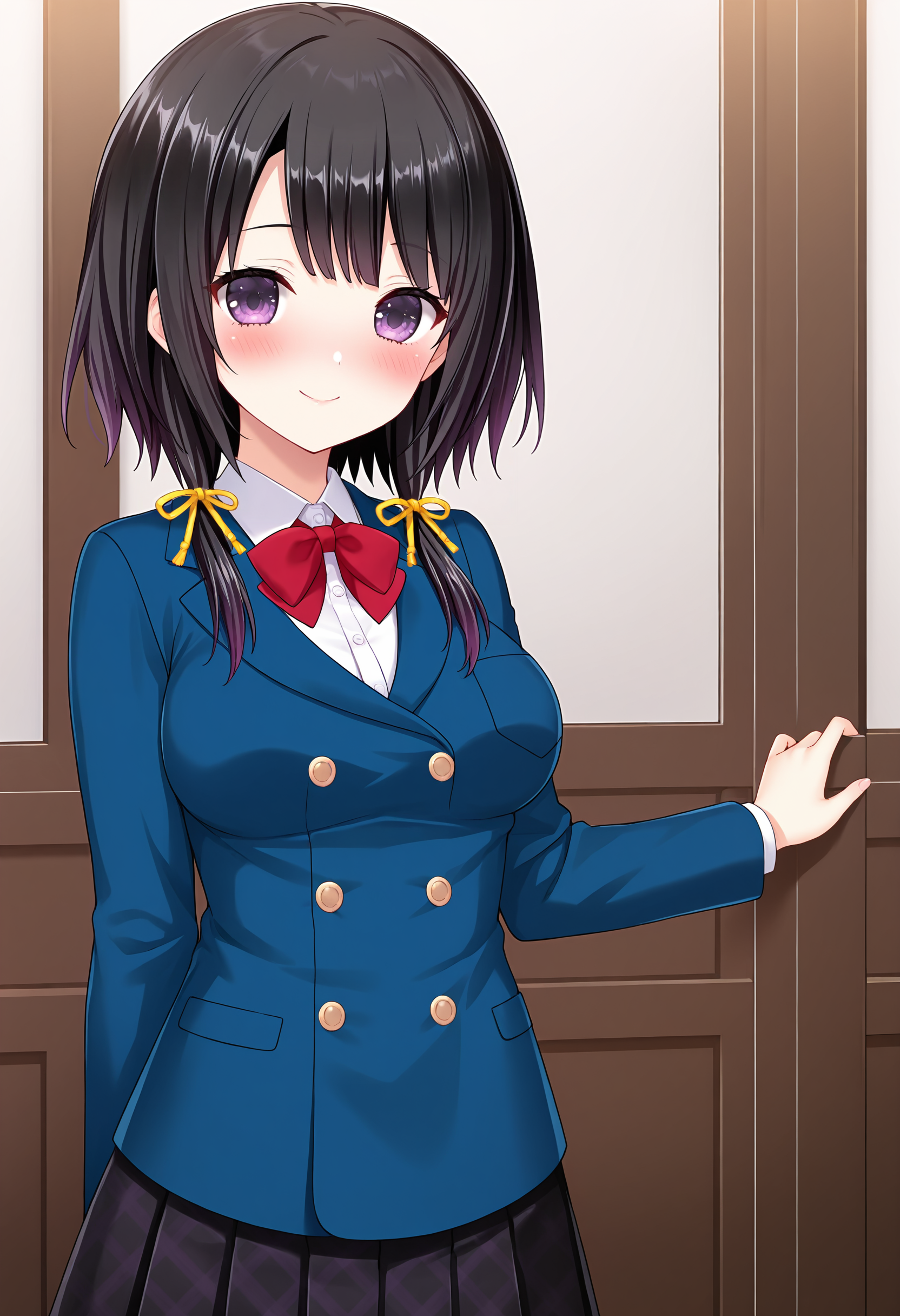 - 1girl,solo,black hair,purple eyes,sidelocks,hair yellow ribbon,
