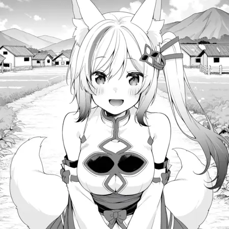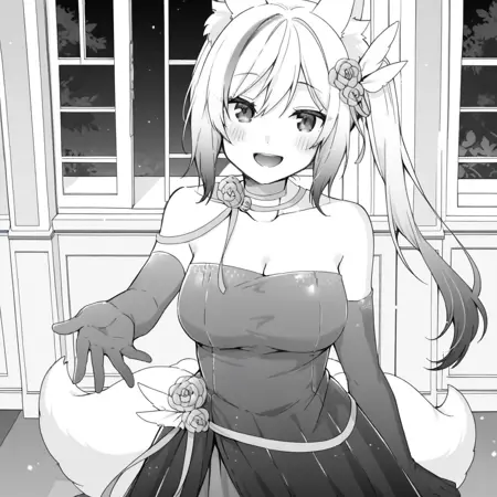 베이스: marina, 1girl, 다색 머리, 긴 머리, 사이드 페인터테일, 동물 귀, 꼬리, 여우 꼬리, 여우 귀, 가슴, 머리 장식