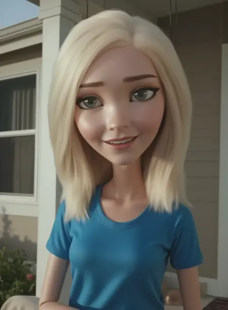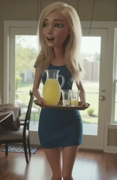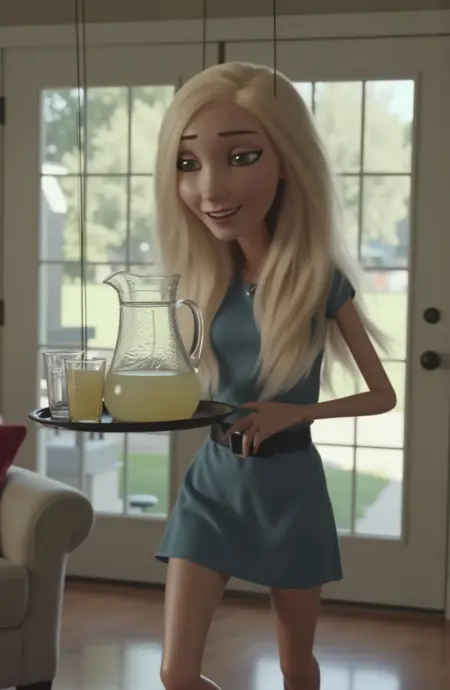 She is a life-sized puppet, with visible ridges at her joints and marionette strings visibly sticking straight up from her hands and feet and body
